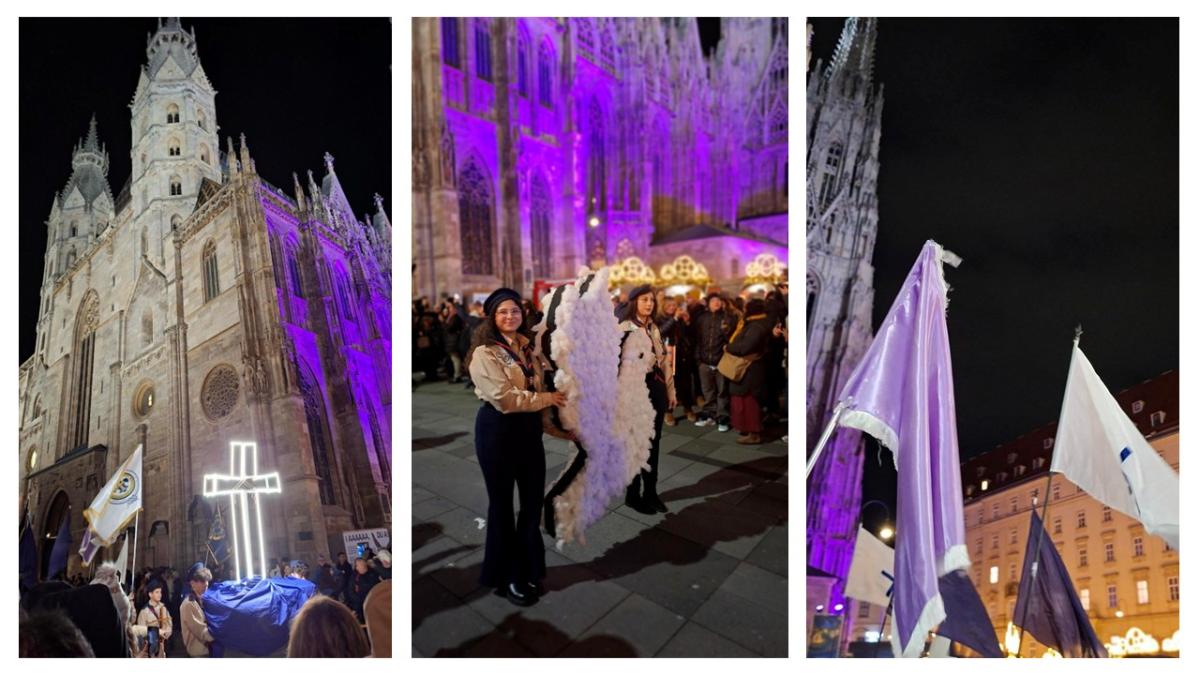 An die 1000 Menschen aus allen Kirchen beteten gemeinsam im Stephansdom für Menschen, die wegen ihres Glaubens verfolgt werden. Besonders bedeutsam war das gemeinsame Vater Unser in Deutsch und Arabisch. Nach dem Gebet zogen alle gemeinsam vom Stephansdom zum Michaelerplatz, allen voraus die Priester und die jungen Pfadfinder aus den verschiedenen Kirchen.